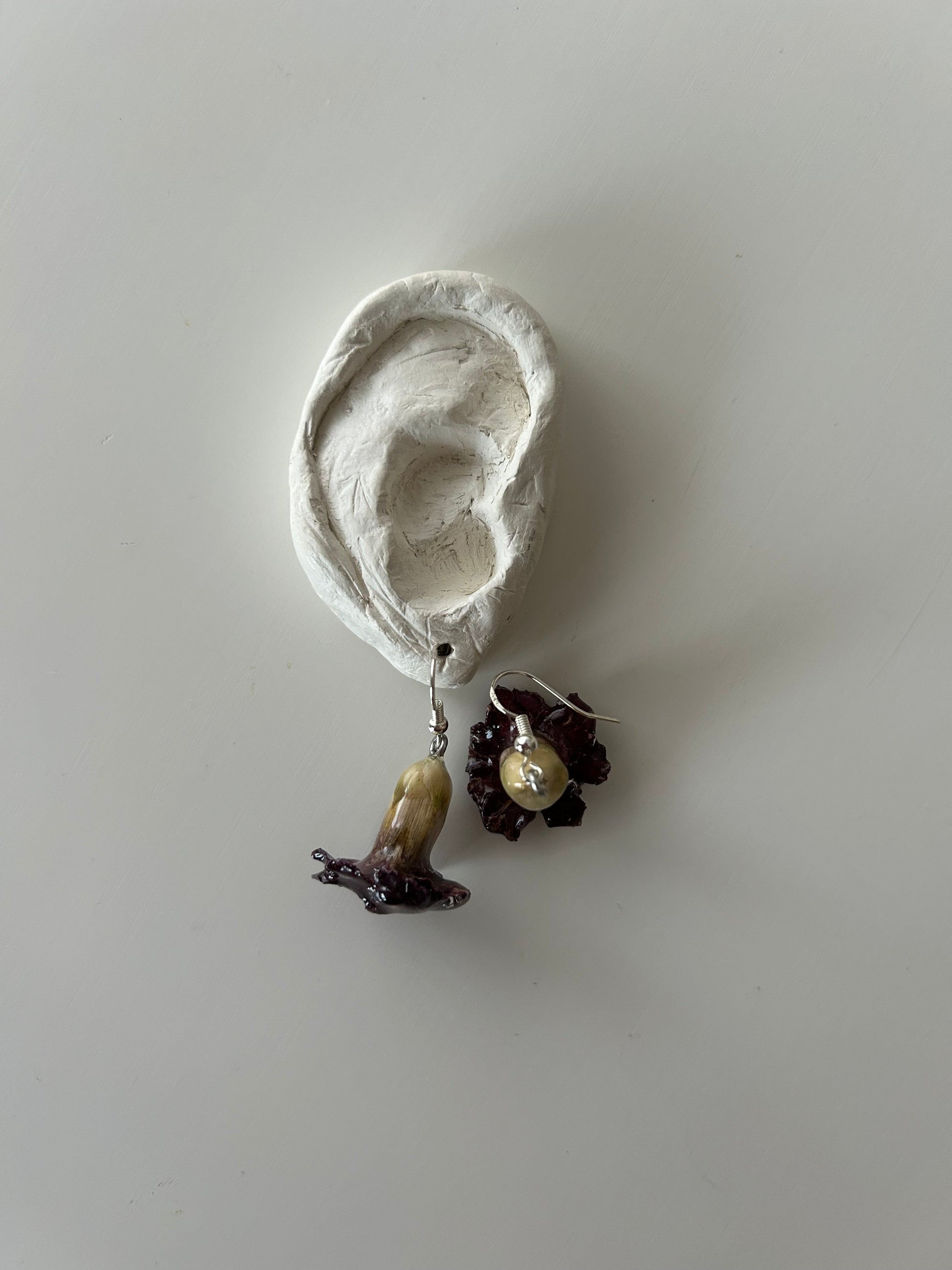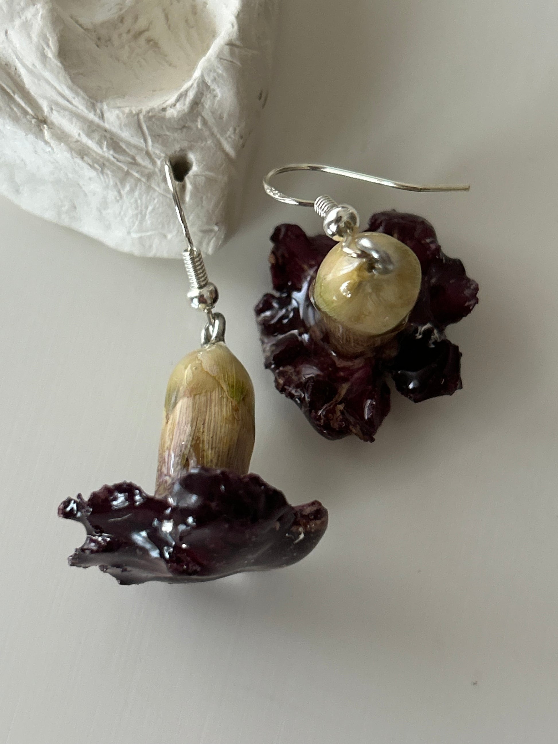 esta peça é feita com duas cravinas vermelhas, secas e envolvidas em resina