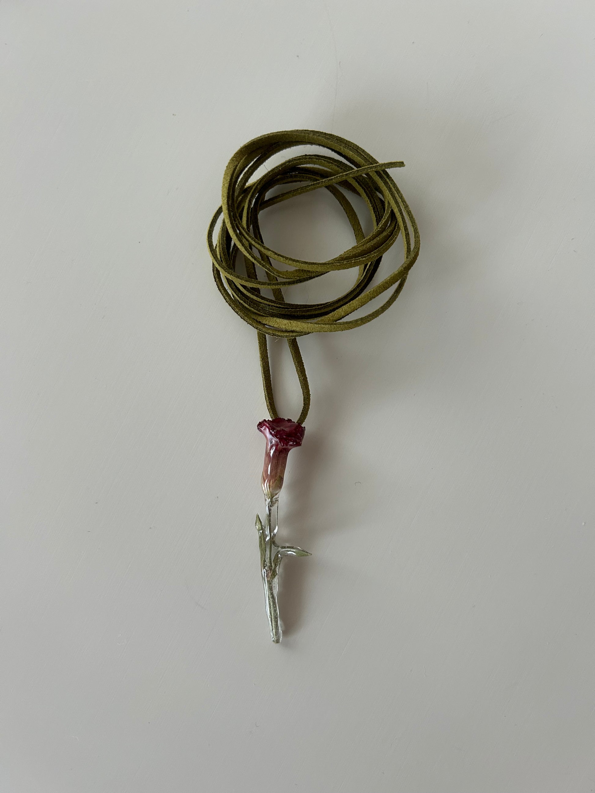 esta peça é feita com uma cravina vermelha verdadeira, seca e envolvida em resina