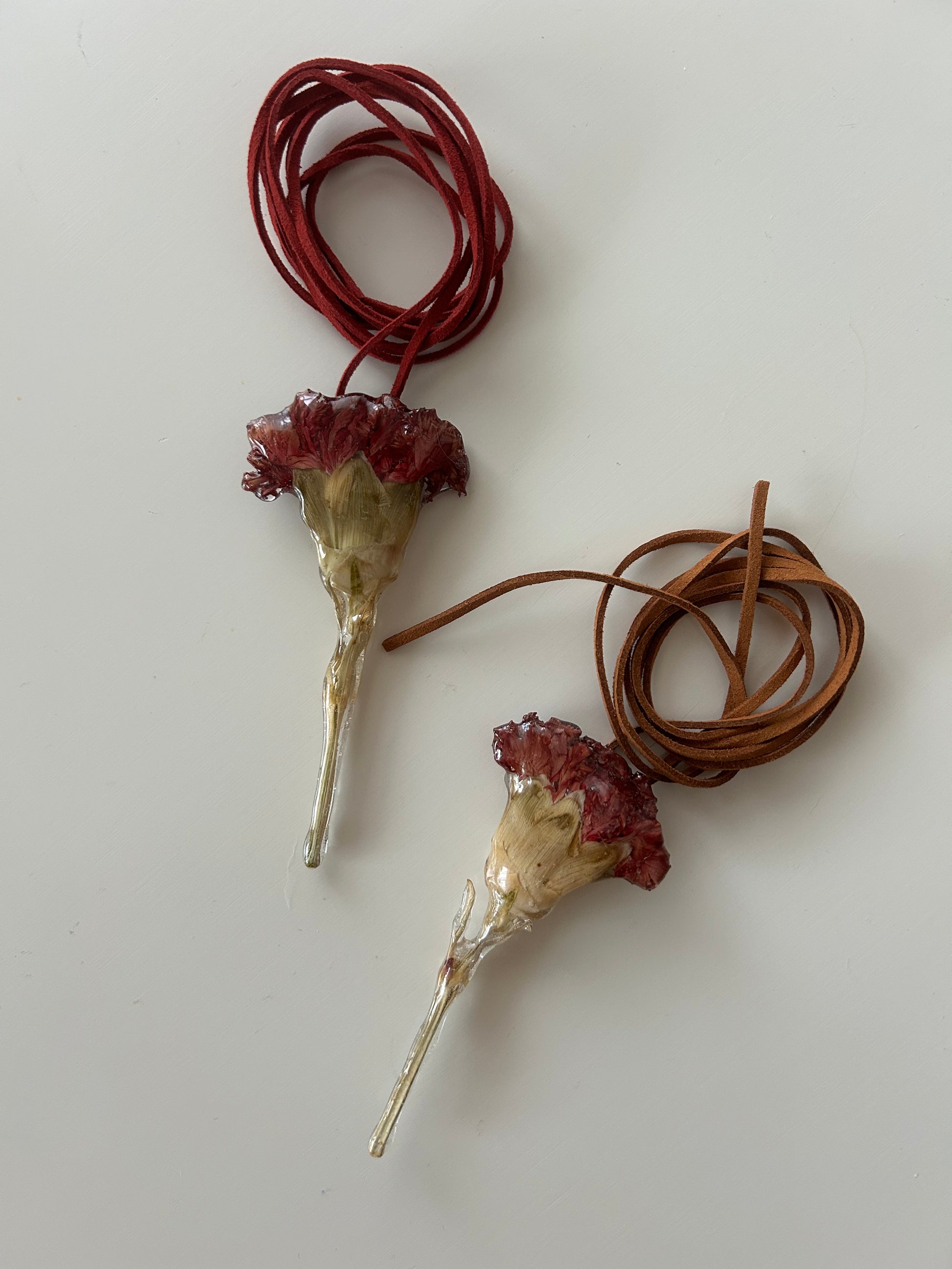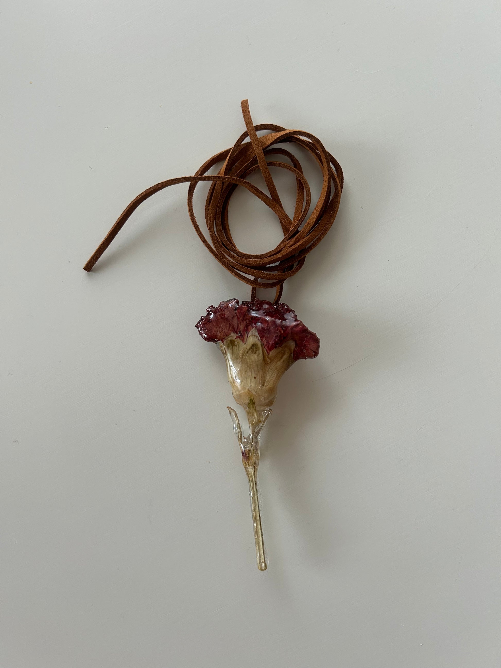 esta peça é feita com um cravo vermelho verdadeiro, seco e envolvido em resina