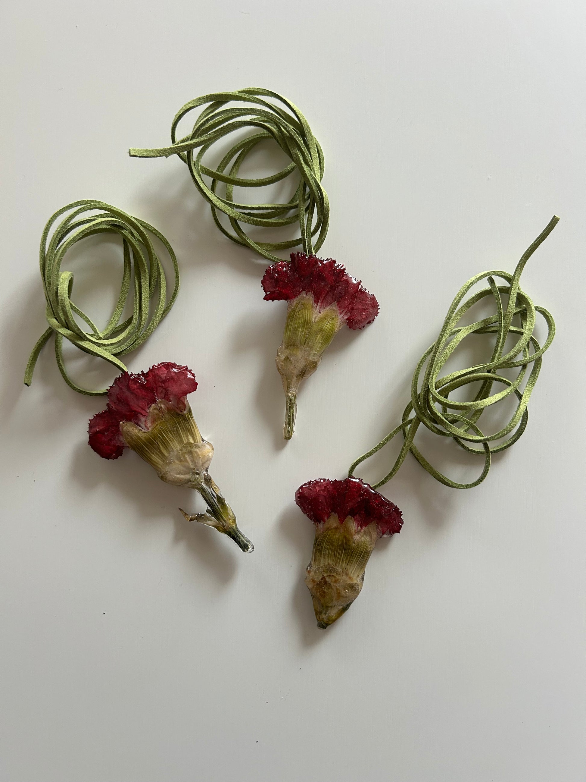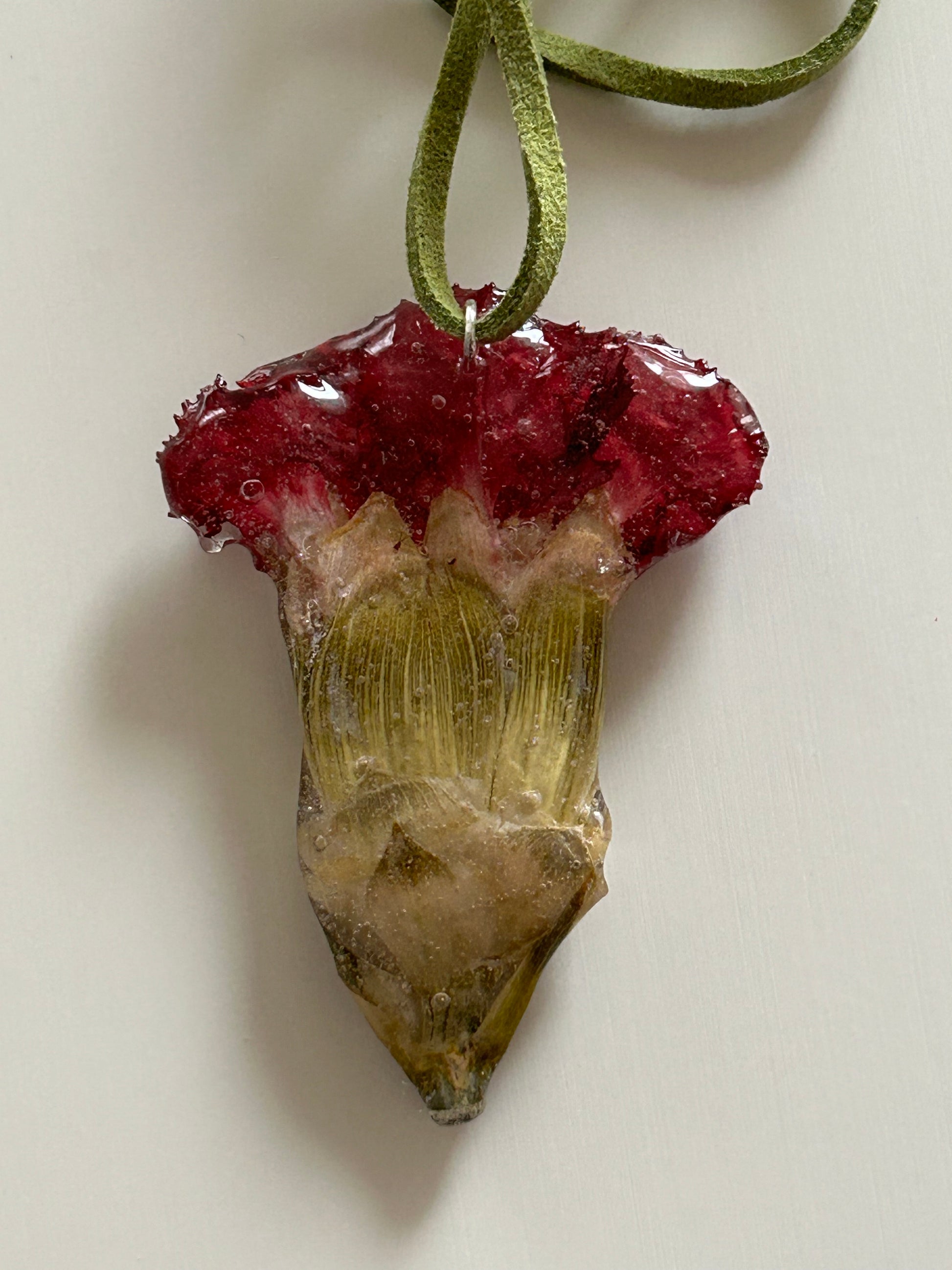 esta peça é feita com um cravo vermelho verdadeiro, seco e envolvido em resina