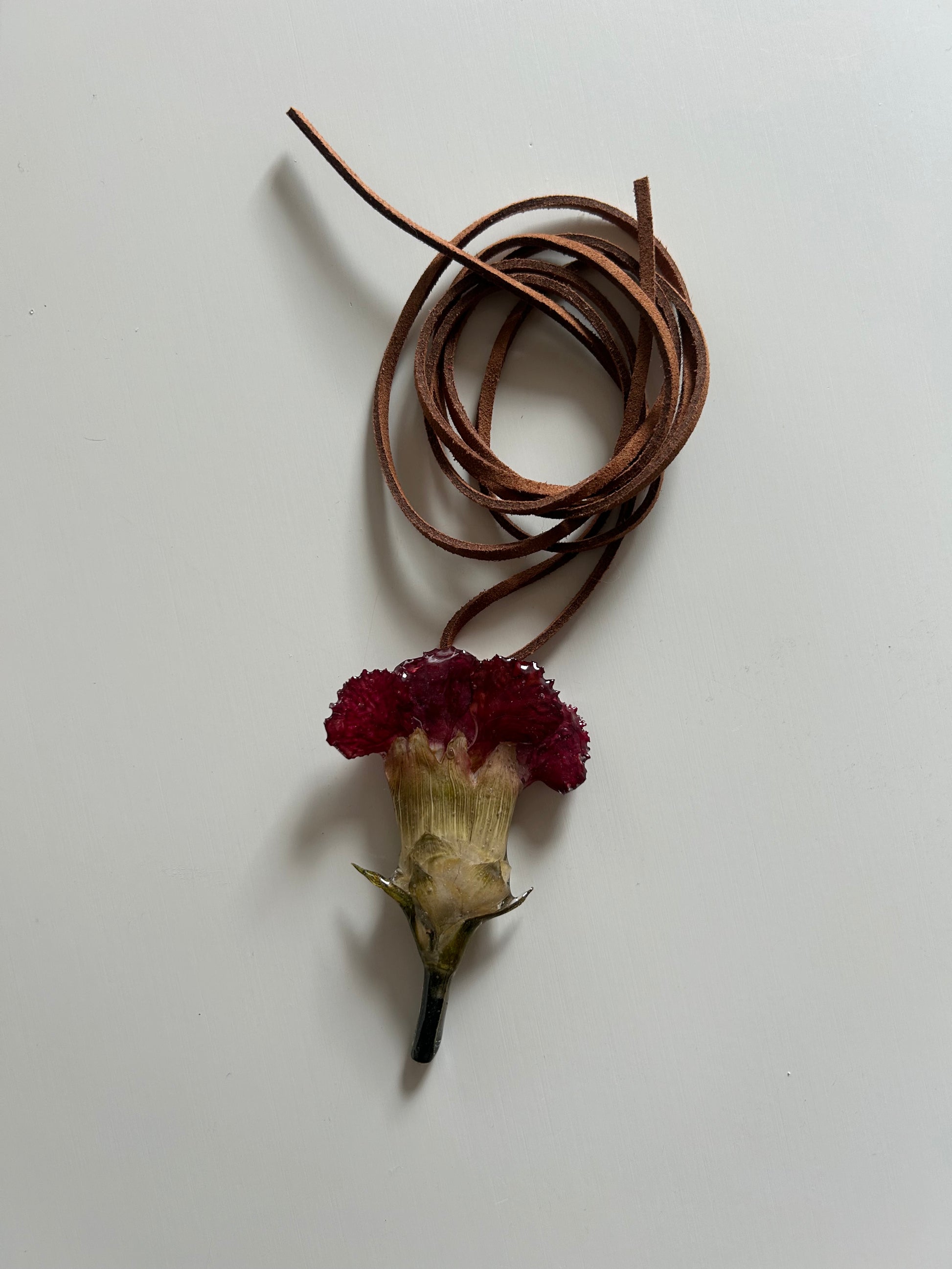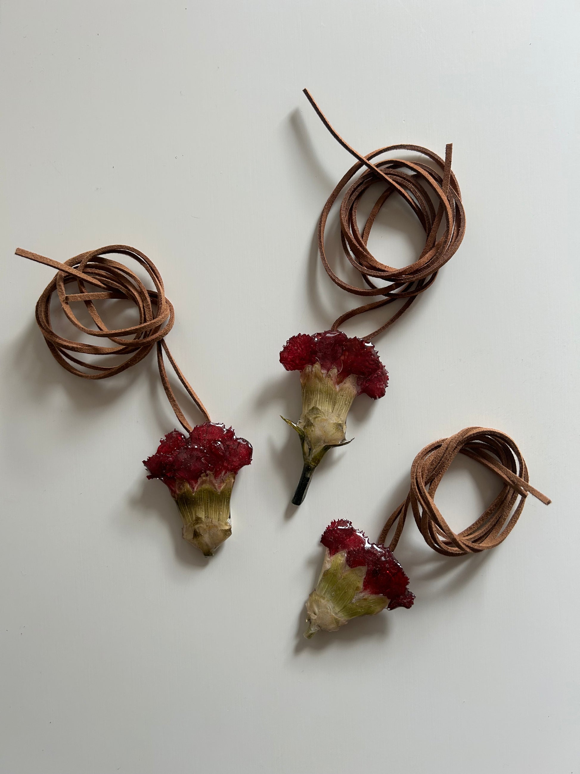 esta peça é feita com um cravo vermelho verdadeiro, seco e envolvido em resina