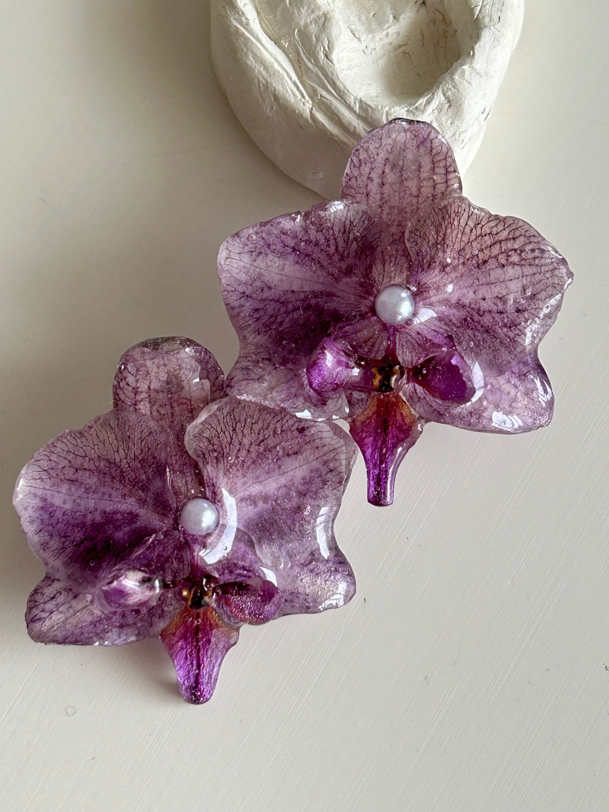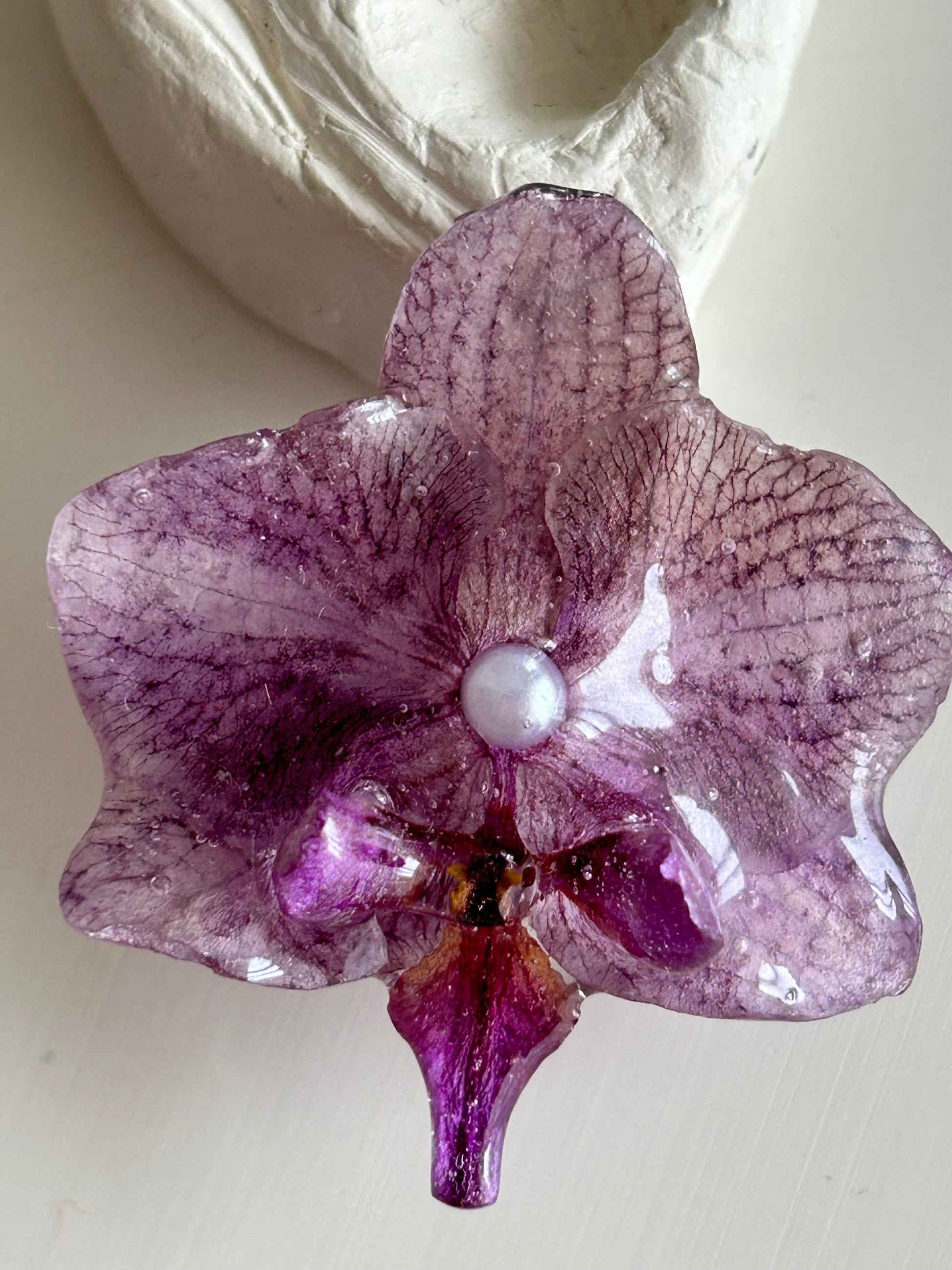 these are REAL phalaenopsis, also known as moth orchid, carefully dried and then preserved in resin with a little plastic pearl on the center